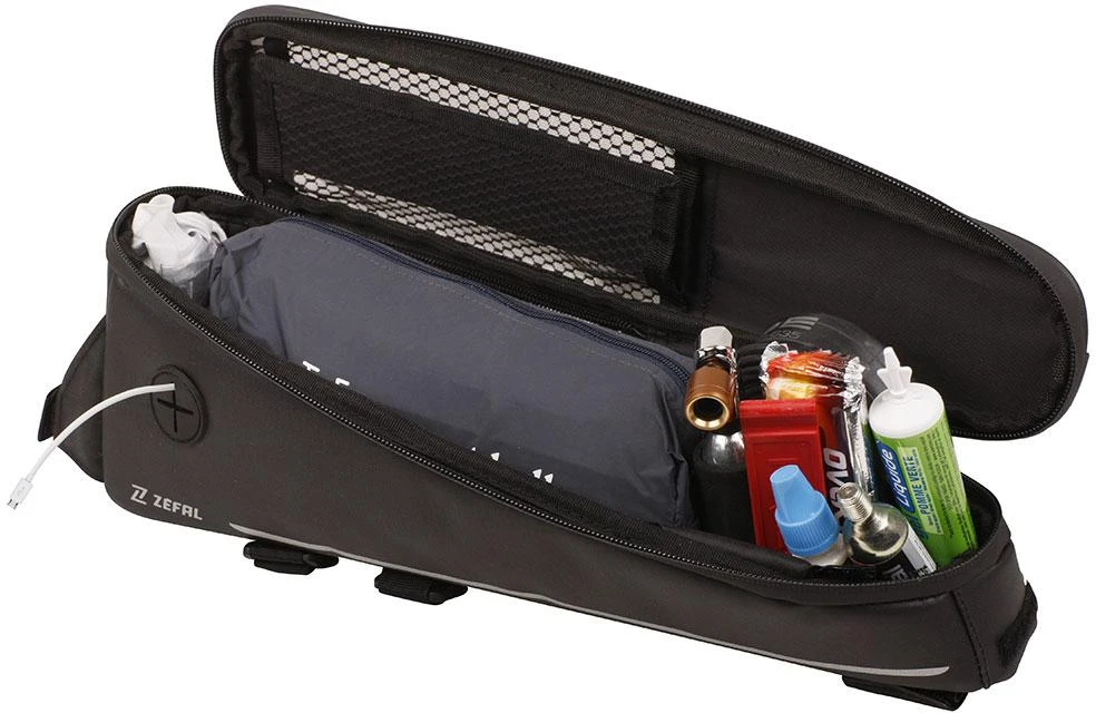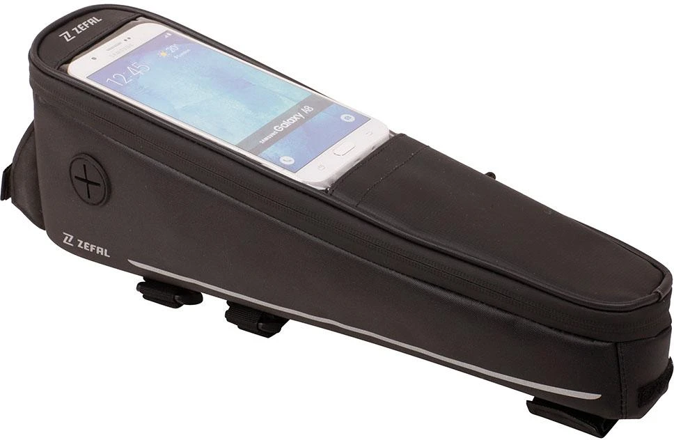 2 in 1, the Console Pack is a top-tube bag with an integrated compartment for smartphones. Easy to install on the tube, it has a zippered compartment to carry most accessories (repair kits, CO2 cartridges, energy gels, keys…). An extra strap is provided, allowing the bag to be mounted on all types of frames. Access to the touch screen allows you to look and record your data. The rain-cover guarantees protection during wet conditions.